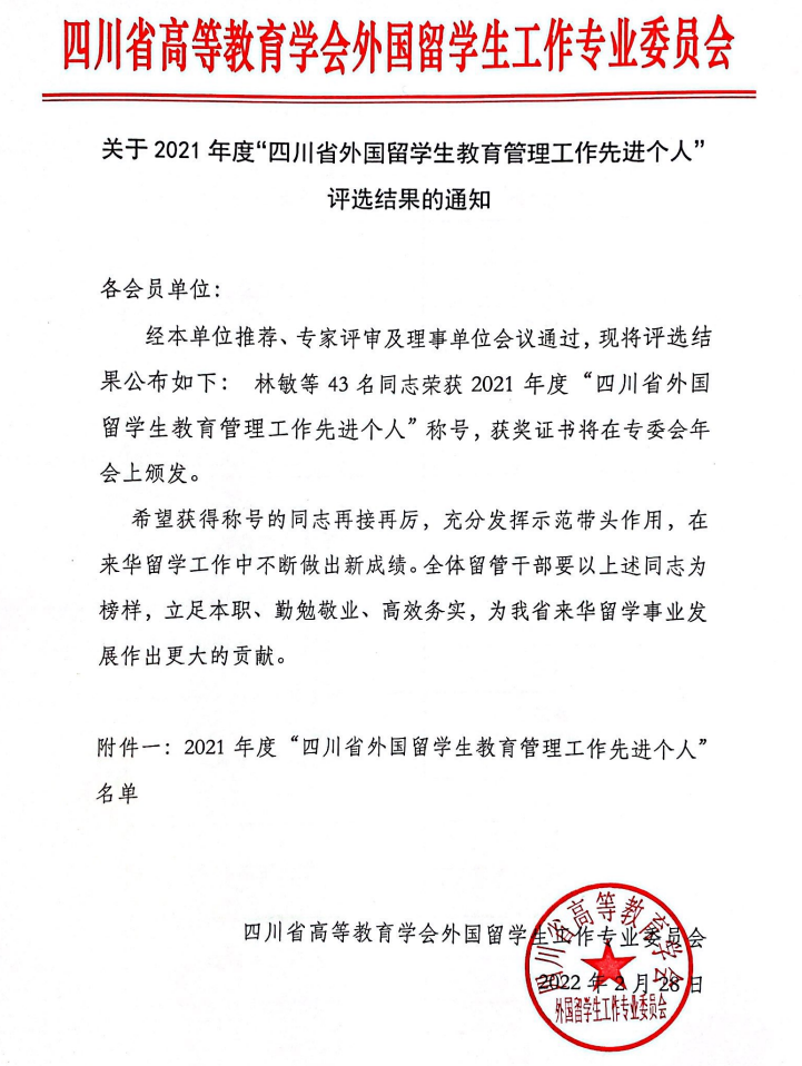 四川省高等教育学会外国留学生工作专业委员会近日公布了2021年度四川省外国留学生教育管理先进个人评选结果,共43名同志入选,其中4名来自高职院校,我院国际学院杨绍颖同志荣获“四川省外国留学生教育管理先进个人”。
