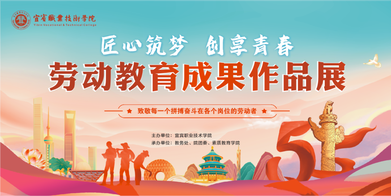 第二个活动项目是2022年5月6日,由教务处、团委、素质教育学院共同承办,各二级学院积极参与的劳动教育周活动——劳动教育成果作品展在宜宾职业技术学院教学楼前举行。