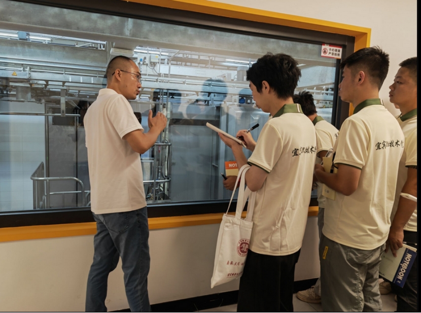 在养殖科技第一线——南溪区德康集团,同学们深入了解每年300万头生猪屠宰线的运作流程、肉食品精深加工及冷链流水线当中所包含的各类“黑科技”,从高浓度二氧化碳致晕肥猪到脉冲自动感应撩毛、火焰灭菌炉、自动开胸开腹机去白脏红脏等,采样镜检、自动包装等自动设施无一不展现科技力量,完全改变了大家对现代畜牧业的认知,增加了专业的自豪感,也增加了专业提升的紧迫感。