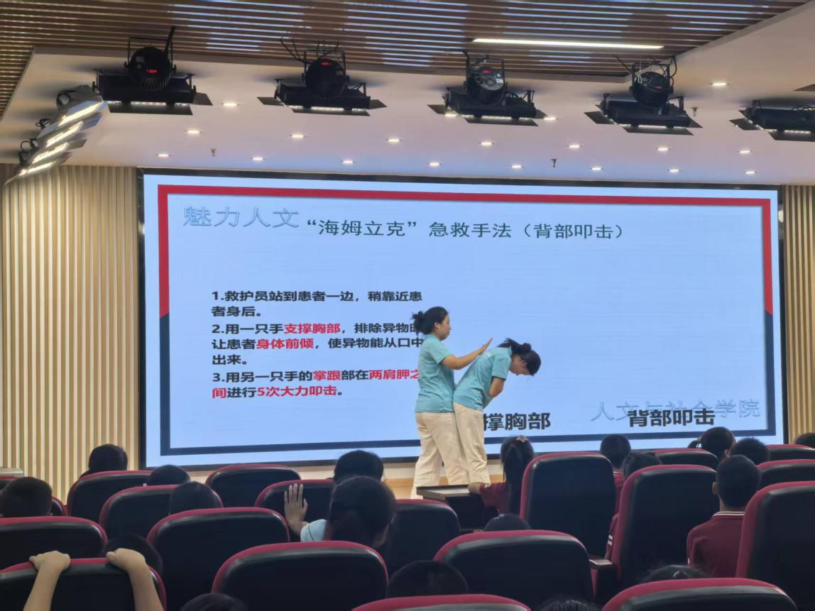 四年级教室内,阳璐西主讲的“红领巾急救员”课程同样亮点纷呈。她结合《中小学公共安全教育指导纲要》,系统讲解了心肺复苏、气道异物梗阻急救等技能,并特别强调:“作为新时代少年,不仅要保护自己,更要学会关爱他人。”学生党员袁明竹、团员李姝静配合演示,分步讲解“海姆立克法”操作要领,随后组织小学生分组练习。