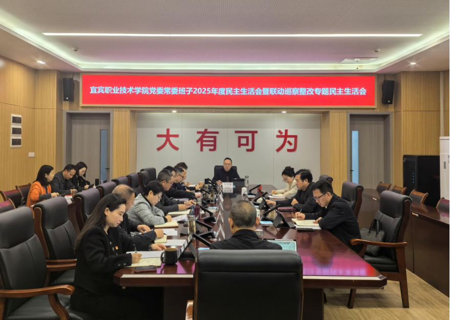 根据党章和党内有关规定,结合市委巡察工作要求和市委“树立正确政绩观、科学谋划十五五”笃学践行专项行动,2月27日,宜宾职业技术学院党委常委班子召开2025年度民主生活会暨联动巡察整改专题民主生活会,会议紧扣主题,各班子成员联系工作实际,严肃认真开展批评和自我批评。会议由学院党委书记伍小兵主持,全体党委常委参会。市委第四巡察组组长唐焱、市纪委监委第五纪检监察室主任黄毅、市委第十二指导组副组长刘学扬等到会指导。学院副院长刘可雕列席会议。