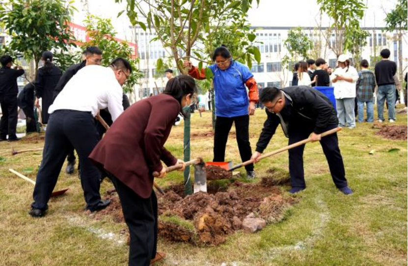 活动现场,人影穿梭,干劲十足。从学校领导到一线教师,再到青年学子,大家三五成群,默契配合。扶苗正干、培土夯实、提桶浇水,一道道工序有条不紊,一个个身影忙碌而专注。在劳动的汗水与欢声笑语中,大家心往一处想、劲往一处使,共同呵护着一株株新苗。这热火朝天的场景,不仅是劳动的画卷,更是宜职院人团结协作、同心同德的生动写照。