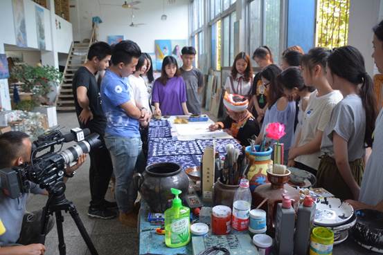 2018月6月,央视农业农村频道(CCTV-17)《乡土中国》栏目拍摄纪录片《走出大山的靛蓝》,讲述宜宾职业技术学院数媒专业师生尝试将苗族蜡染与现代设计结合,老艺新生的全过程,制作完成“一抹靛蓝”帆布包,随后我院与苗族蜡染国家非遗传承人王力洪达成合作,成立王力洪大师工作室。