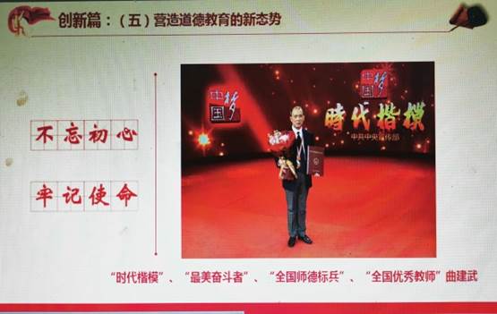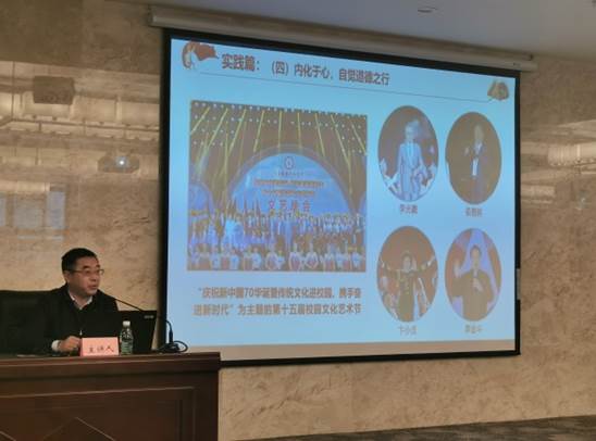 林世全书记从“实践篇、挑战篇、创新篇”三大部分讲述了我院学生思想道德教育的实践和探索。实践篇从“正本清源,凸显根本之位”、“鼎承大同、钵传天工之训”、“完善体系,形成道德之制”、“内化于心,自觉道德之行”四个方面进行阐述,列举了我院学生“中国最美考生”宜宾市第三道德模范黄子恒、“全国自强模范”王龙奎等先进事迹和李光羲、姜嘉锵、卞小贞、李金斗老艺术家的传统文化进校园活动,“时代楷模、最美奋斗者、全国师德标兵、全国优秀教师”曲建武教授给全院的“不忘初心牢记使命 在学生心灵埋下真善美的种子”主题报告等活动。挑战篇从“百年变局之挑战”、“西方演变之挑战”、“社会转型之挑战”、“职教变革之挑战”、“网络新媒体之挑战”五个维度进行了剖析。创新篇明确提出“根植道德教育的新理念”、“构建思政教育的新格局”、“形成思想教育的新体系”、“塑造校园文化的新内涵”、“营造道德教育的新态势”五个“新”。“新理念”就 是要养成正确的思想和理论、要树立远大理想和时代追求、要养成良好的道德品质。“新格局”就是推动形成“大思政”育人格局,核心内涵是“党委统一领导、专业化运行、协同化育人,形成人人都是思政教育者的大思政格局。“新体系”就是形成“三全育人”新体系,建立一条思想政治教育主线、实施“党建示范引领”和“思想政治教育”两项工程、开展“思政课改革创新”“课程思政深入推进”“校园文化建设创新”“文化活动精品塑造”四项活动、抓牢“课程、科研、实践、文化、网络、心理、管理、服务、资助、组织”十个方面的育人思想政治工作实施体系。“新内涵”就是要以新 文化建设内涵塑造新的校园文化。“新态势”就是要在全校营造起“学校无闲人、人人都育人,学校无闲事、事事都育人,学校无闲时、时时都育人,学校无闲处、处处都育人”的育人理念和育人态势。