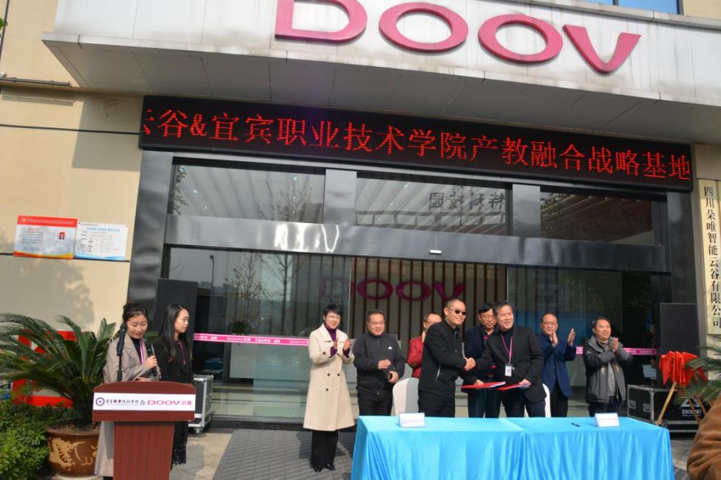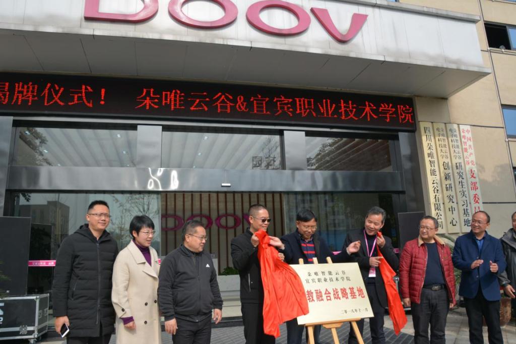 在政、校、企三方领导的共同见证下,校企双方现场签约,并由政府、学校、企业三方领导共同揭牌。签约揭牌仪式由四川朵唯智能云谷有限公司人事行政总监卢平主持,宜宾职业技术学院院长伍小兵、朵唯云谷总裁何明福、宜宾临港经济技术开发区党工委委员、管委会副主任侯荣分别致辞。