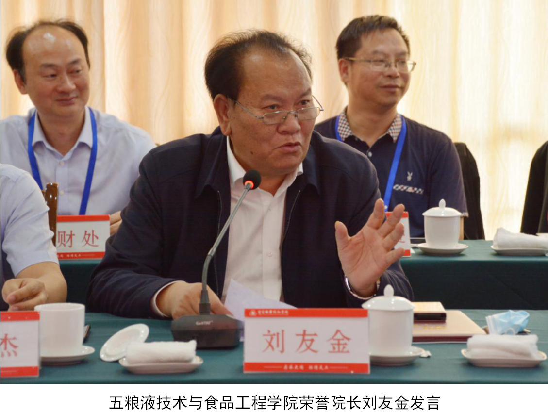 五粮液技术与食品工程学院荣誉院长刘友金在发言中表示五粮液股份有限公司与宜宾职业技术学院的合作由来已久,情谊深厚,学院以优秀的师资队伍、出色的教学资源为白酒行业的发展培养了一大批优秀技术技能型人才,希望能在以后的工作中贡献一生的酿酒经验,与各位教师一起学习交流,为中国白酒行业培养高素质的生产管理技术人才,共同推动学院建设和高质量发展。