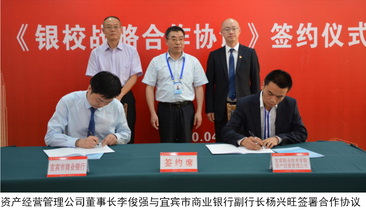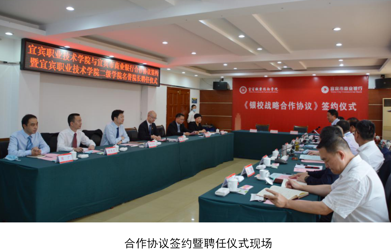 4月29日下午 15:00,宜宾职业技术学院与宜宾市商业银行战略合作协议签约暨宜宾职业技术学院二级学院名誉院长聘任仪式举行。宜宾市商业银行党委副书记、行长薛峰,党委委员、副行长杨兴旺,原宜宾五粮液股份有限公司副总经理、宜宾多粮浓香白酒研究院院长、首届中国酿酒大师刘友金,宜宾丰川动力科技有限公司总经理陈红旭,宜宾市智威科技有限公司总经理蒋杰,宜宾职业技术学院党委书记林世全,院长伍小兵,党委副书记、纪委书记陈林,副院长张毅、闫景丽,组织部部长江仁朝出席签约仪式。签约及聘任仪式由陈林主持。