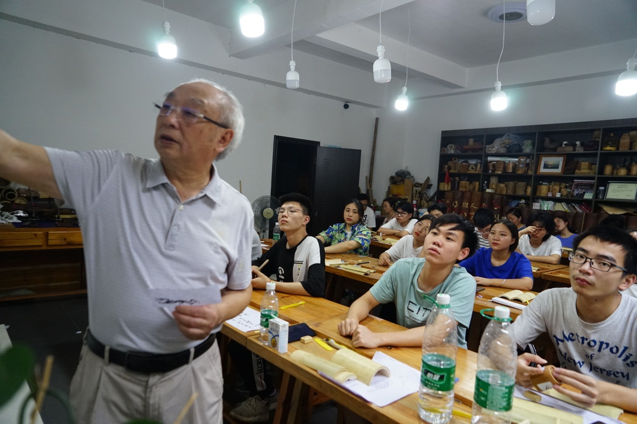 在品鉴环节,老师们带领学生一一观赏馆内藏品,生动直观地向学生介绍了江安竹簧的发展史、工艺特征、观赏价值。学生们更有幸参观了中国竹工艺大师、首届四川省工艺美术大师、国家级非物质文化遗产、江安竹簧省级传承人何华一老先生的工作室,沉浸于何老先生的代表作品《长江颂》、《江山如画》、《巴山夜雨》所散发出的艺术魅力中。
