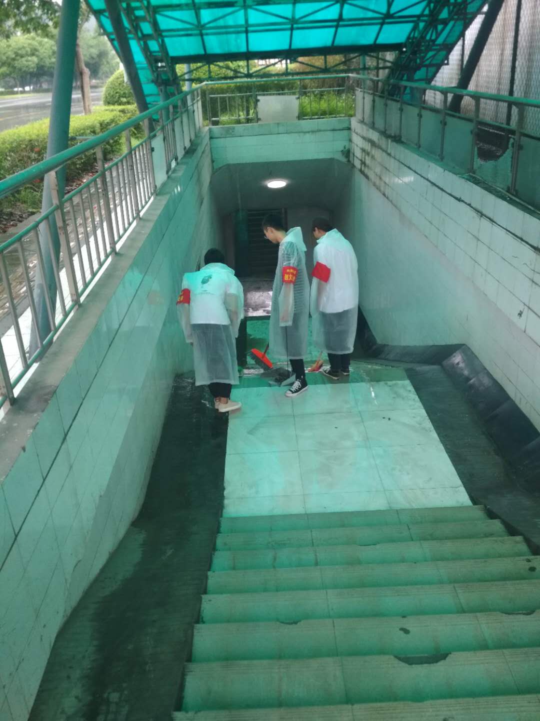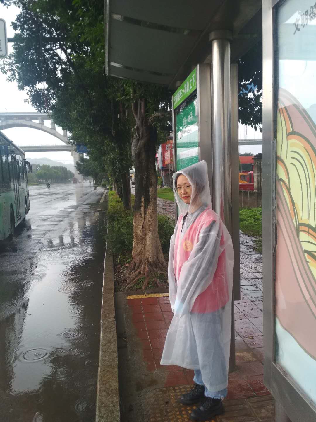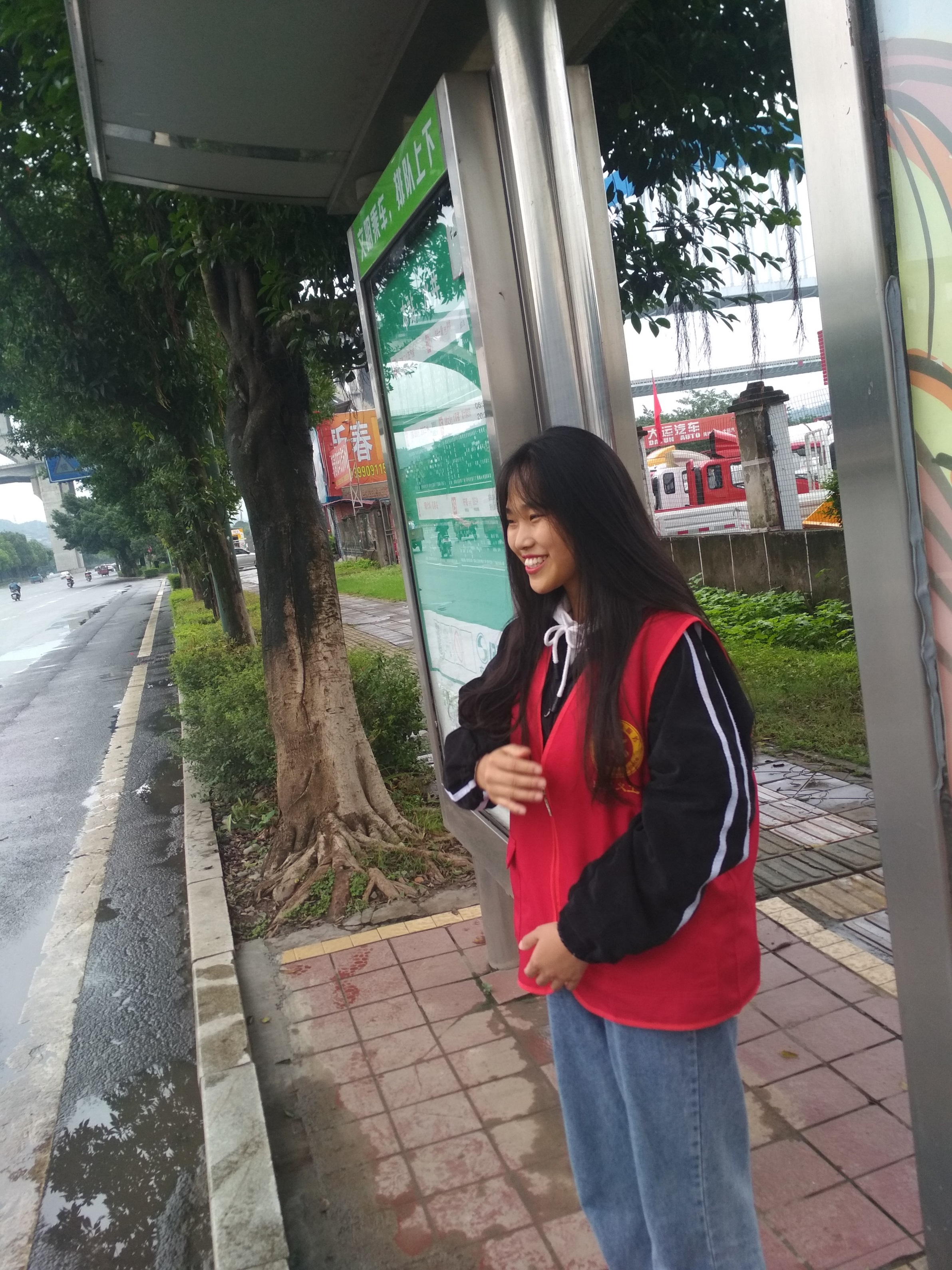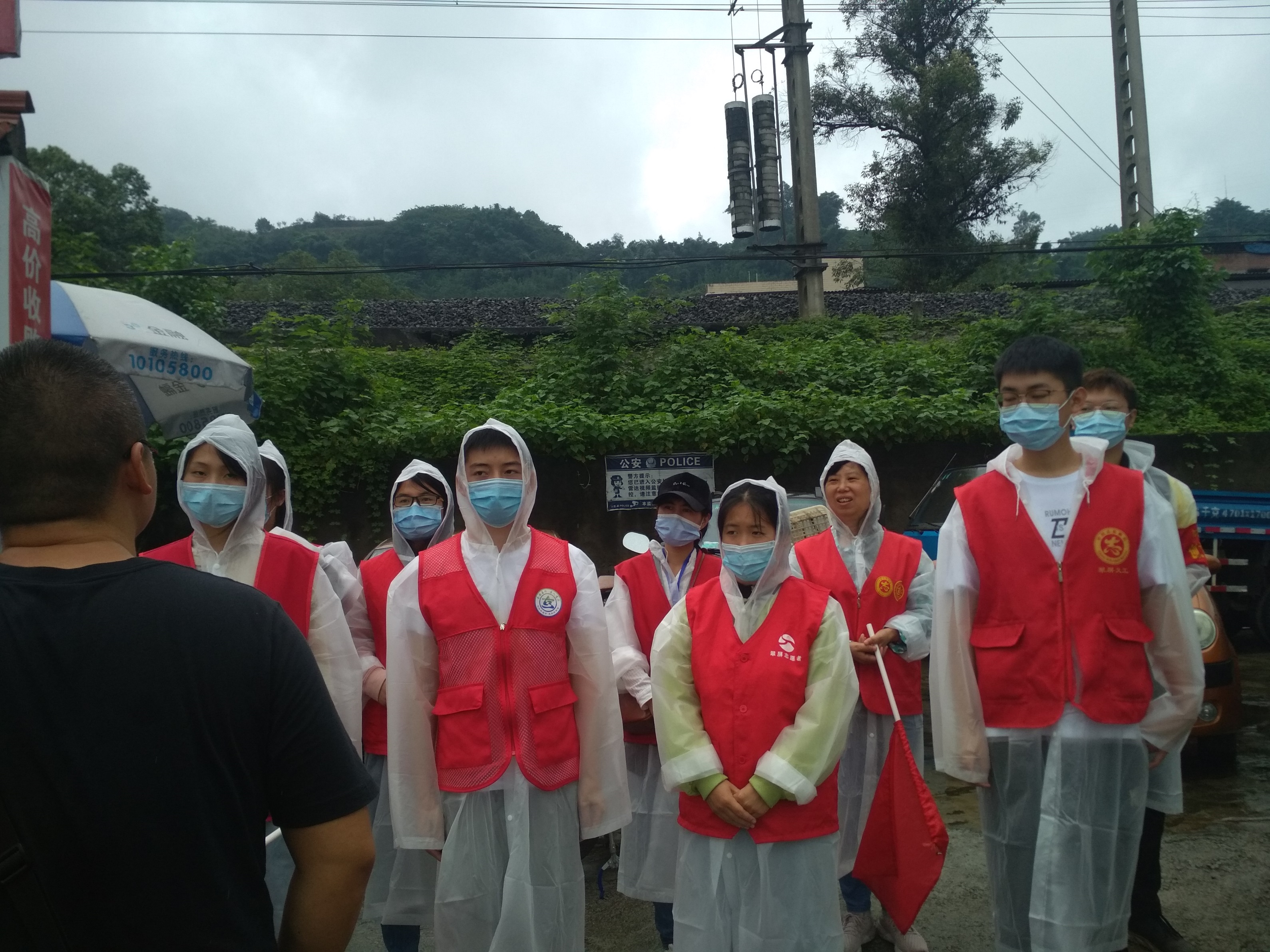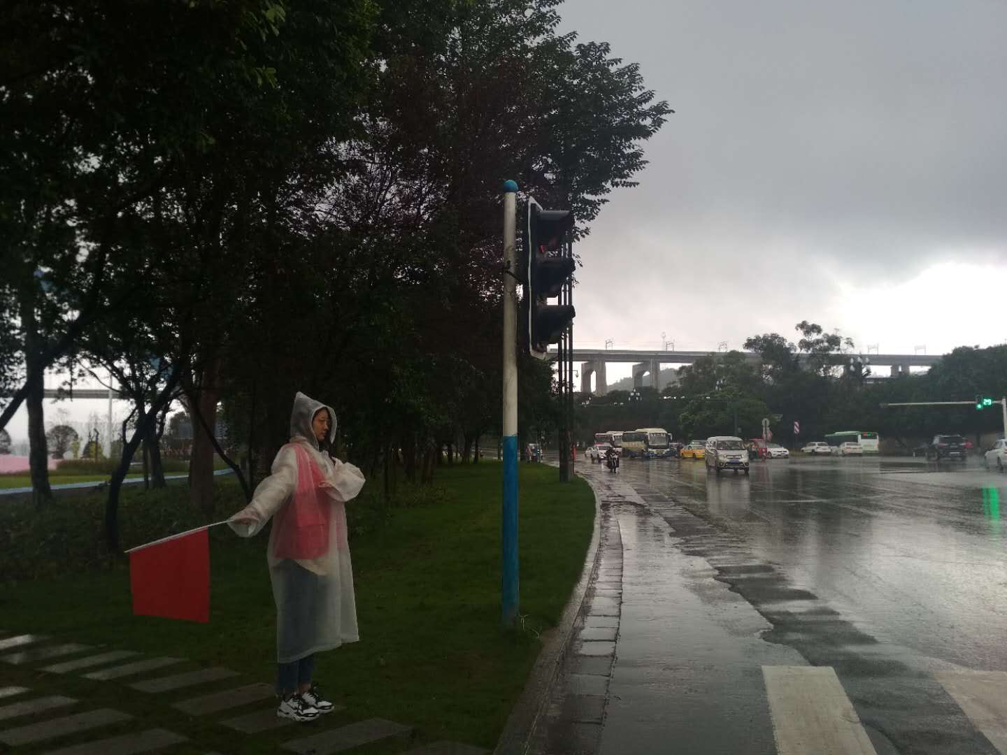 清晨6点半,天色阴暗,晨光熹微。宜职院各院系大二、大三的学生,便在带队老师带领下早早的来到高庄桥笋子厂站附近聚集点。他们内穿红色志愿服,外披雨衣,在社区工作人员和老师指导下定点分工,井然有序地开展自己的义工工作。他们五点多钟就起床,由于起得早,早饭都没来得及吃,饿着肚子就走上了各自的值守岗位,直到附近商铺开门,老师们送来食物,才得以在风雨中匆匆进餐。风雨之中,一站就是五六个小时,但师生们没有人叫苦叫累,脸上汗水和雨水混在一起,分不清哪是汗水哪是雨滴。在社区街道、居民小区、公交站牌、公路路口及人行道上,随处都可看见志愿者们忙碌的身影。他们或手持扫把撮箕,认真清扫地面积水和垃圾;或手执红色小旗,严格指挥过往车辆和行人,或笑容可掬,往来协助乘客上下公交车。尽管天空淅沥,地面泥泞,但只要身穿红色志愿服的师生走到哪里,哪里就成为一道亮丽的风景。