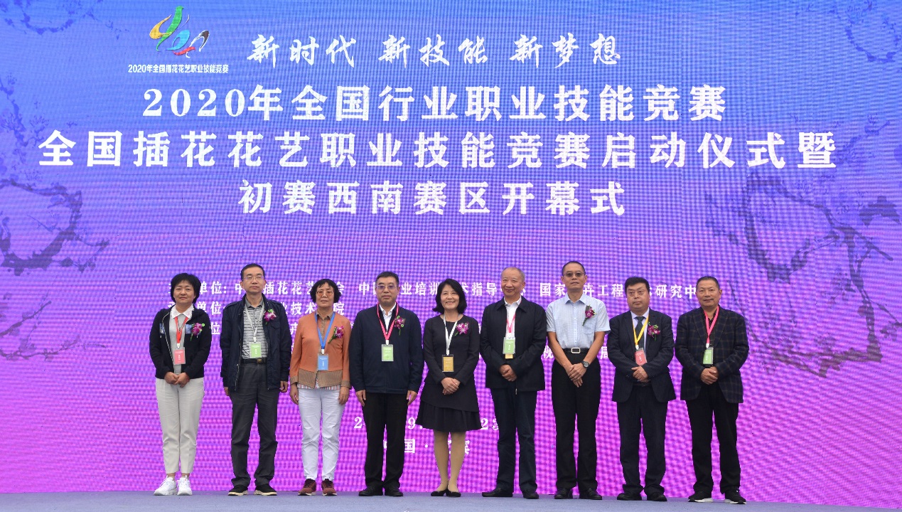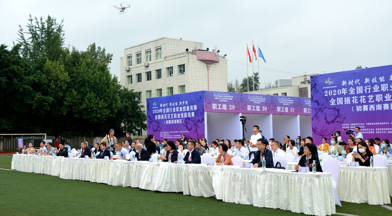 中国插花花艺协会会长刘燕、副会长唐秋子、秘书长薛立新,副秘书长刘政安、王彩云、马力为,副秘书长、世界技能大赛花艺项目专家组组长朱迎迎,世界技能大赛花艺项目教练组组长项一鸣,四川省花卉协会常务副会长刘照高、副会长张锡九等行业领导和专家,市级相关部门领导,宜宾职业技术学院党委书记林世全、院长伍小兵、副院长张毅、副院长古文伟、组织部长江仁朝等在家领导出席了大赛开幕式。开幕式由宜职院副院长周黎军教授主持。