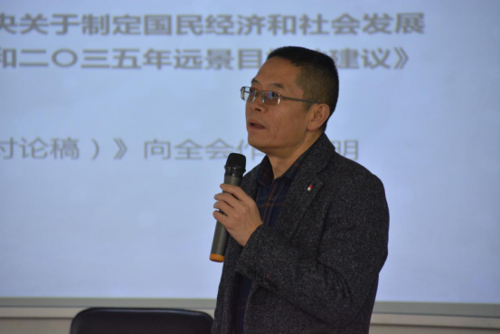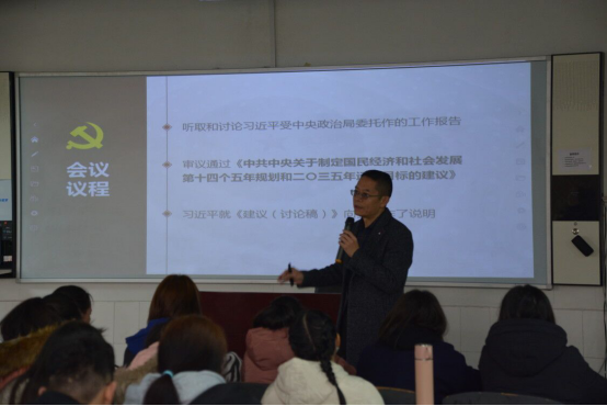 伍小兵从五年一届的中央全会说起,娓娓道来,引入党的第十九届中央委员会第五次全体会议,再从十九届五中全会的议程、意义及《“十四五”规划建议》起草过程切入,结合当下时事热点和职教的前景,重点从七个大的方面对十九届五中全会精神做了具体而深入的阐述:先从“脱贫攻坚战胜利在望”“全面建成小康社会取得决定性成就”“抗击新冠肺炎疫情斗争取得重大战略成果”“综合国力和国际影响力显著提升”“十三五发展大大提升了宜宾影响力”五个方面谈如何“深刻认识党和国家事业取得的历史性成就和改革发展大势”;再从“世界百年未有之大变局”“中华民族伟大复兴的战略全局”两个方面引导师生“深刻认识我国发展环境面临的深刻复杂变化和‘十四五’时期重要战略机遇期的新特征”,结合国际国内形势分析指出我国发展仍然处于重要战略机遇期,机遇和挑战前所未有,危中有机且危可转机;接着依次从“《建议》核心要义体现在‘三个新'”“进入新发展阶段是中华民族伟大复兴历史进程的大跨越”“建设社会主义现代化具有五个重要特征”“全面贯彻新发展理念”“正确理解新发展格局,要把握好‘三个是、三个是’”“构建新发展格局是系统工程,要把握好六个着力点”六个方面分析了“深刻认识新发展阶段、新发展理念、新发展格局的科学内涵和理论与实践逻辑”;之后,通过“从九个方面来把握2035年基本实现社会主义现代化的远景目标”“‘十四五'时期经济社会发展的指导思想需要认真把握的关键点”“‘五个坚持'——‘十四五’时期经济社会发展必须遵循的基本原则”“‘六个新'——‘十四五’时期经济社会发展的主要目标”,围绕推动高质量发展的“十四五”时期经济社会发展的重点任务的12个重点任务等方面全面阐释“深刻认识2035年远景目标和“十四五”时期发展的指导方针、主要目标、重点任务”;随后强调指出“实现‘十四五’规划和2035年远景目标,必须坚持党的全面领导,充分调动一切积极因素,广泛团结一切可以团结的力量,形成推动发展的强大合力”这是“深刻认识加强党的领导是实现‘十四五’规划和2035年远景目标的根本保证”;最后从“作出3个初步判断”“未来五年我们要努力实现八个新跨越”两个方面讲如何“紧密结合四川实际,推动全会精神在巴蜀大地落地生根、开花结果”,号召师生紧密团结在以习近平同志为核心的党中央周围,同心同德、顽强奋斗,奋力推动治蜀兴川再上新台阶,为夺取全面建设社会主义现代化国家新胜利贡献学院力量!