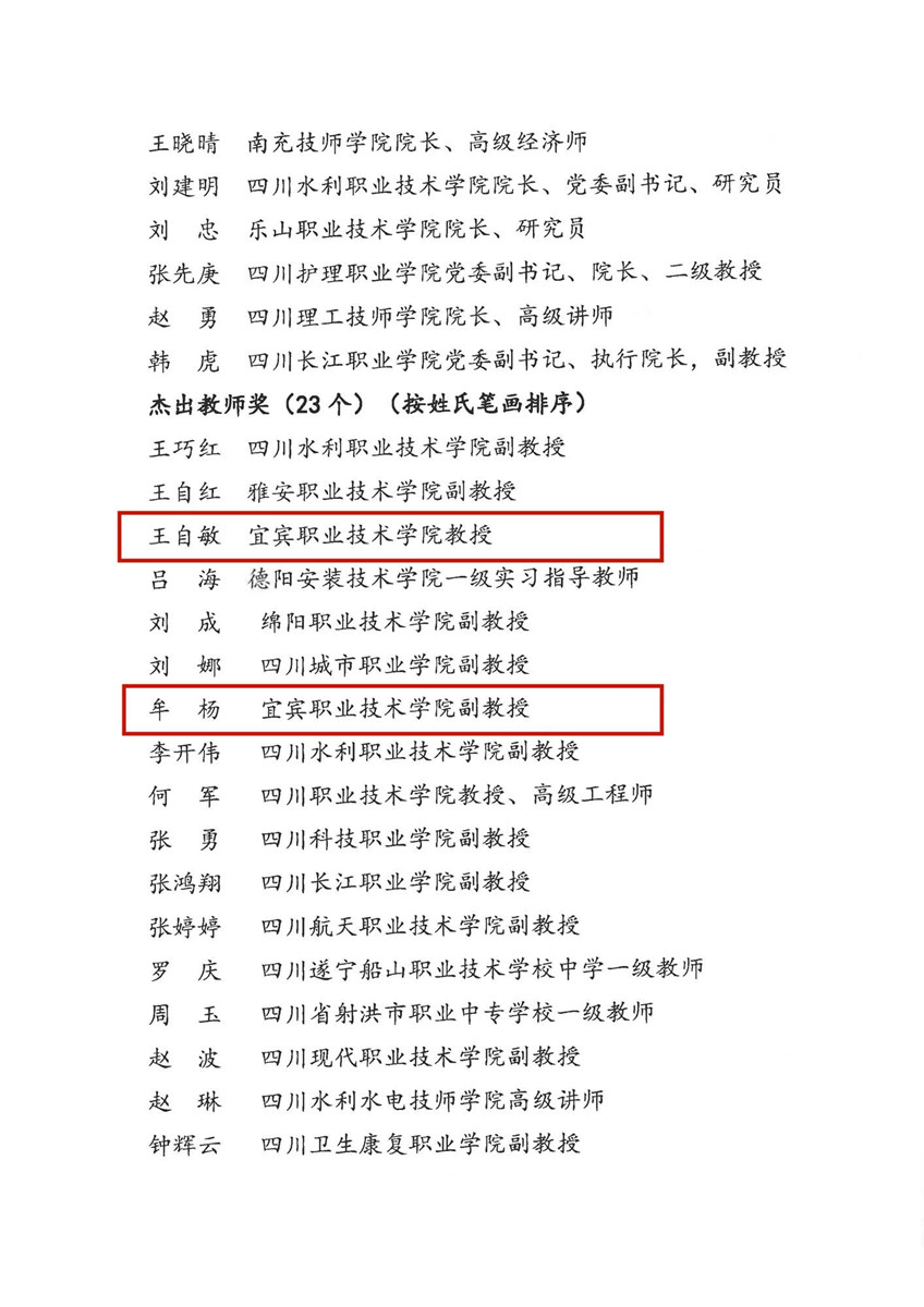 近日,四川省中华职教社和重庆市中华职教社在两地教育、人社部门支持下,共同开展了首届“双城杯”黄炎培职业教育奖评选结果揭晓。我院王自敏教授、牟杨副教授、曾欣副教授获“杰出教师奖”。