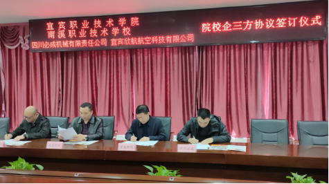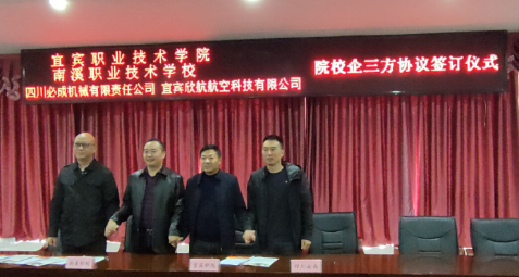 图5我院与南溪职校、四川必成机械、宜宾欣航航空有限公司签约成功