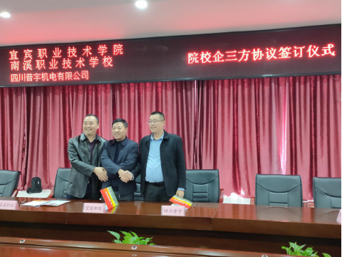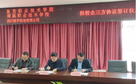 图3我院与南溪职校、四川普宇机电有限公司签约成功