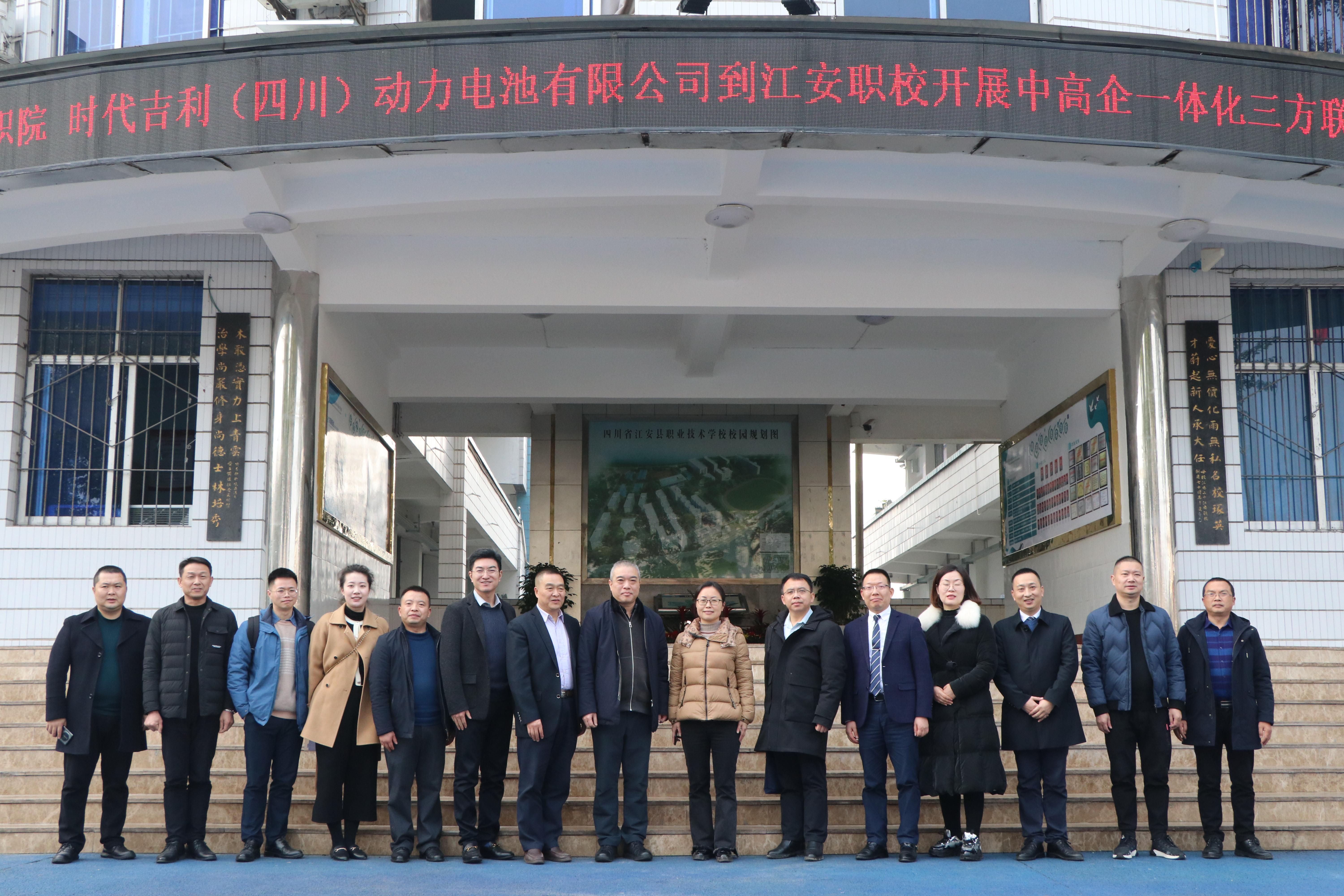 为了进一步实现人才培养目标与职业岗位需求对接,2021年12月22日,院党委常委、副院长江仁朝率新材料与化工能源学院党总支副书记、副院长曾碧涛一行赴江安县职业技术学校参加中高企一体化三方联合培养订单班签约仪式。时代吉利(四川)动力电池有限公司运营总监钟辉以及人力资源总监辛志刚、江安县人民政府副县长范晓莉、中共江安县委教育工委专职副书记罗铜亲临签约仪式现场。