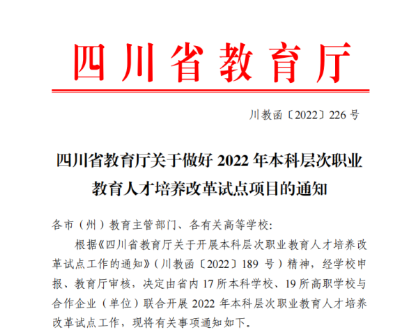 5月21日,四川省教育厅(川教函〔2022〕226号)批准我院酿酒工程和机械电子工程专业作为“2022年本科层次职业教育人才培养改革试点项目”。