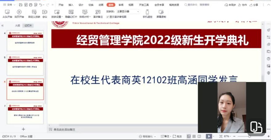 来自2021级商务英语2班的高涵同学结合自己在学院的求学历程,用“雄关漫道真如铁,而今迈步从头越”同新生共勉,希望学弟学妹们能汲取知识的甘露,常行君子之事;能胸怀大爱之心,格守文明之约;能常思肩负之责,永存自信之心。