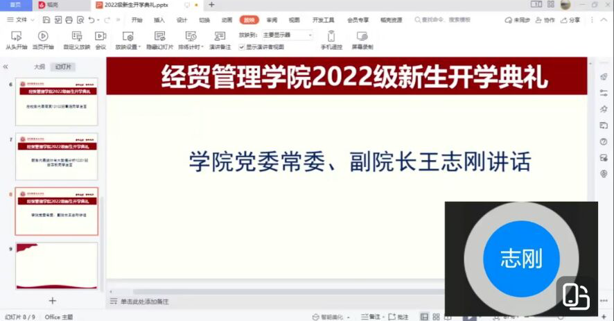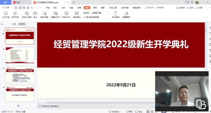 金秋送爽,希望绽放。在这收获的美好时节,经贸管理学院迎来了470名2022级新生。由于当前新冠疫情形势严峻,9月21日上午,我院通过线上直播的方式举行了2022级新生开学典礼。经贸管理学院全体干部教师和2022级新生参加典礼。学院党委常委、副院长王志刚出席典礼并讲话。开学典礼由党总支书记周杰主持。