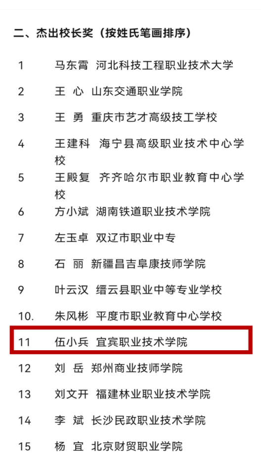 本届黄炎培职业教育奖共设立优秀学校奖50个,杰出校长奖50名,杰出教师奖100名,杰出贡献奖8个。经各省级职教社推荐、专家初审、评审委员会复审后,提交评选表彰工作领导小组终审,产生了获奖名单。我院党委副书记、院长伍小兵作为国家级教师教学创新团队负责人,入选全国杰出校长奖。