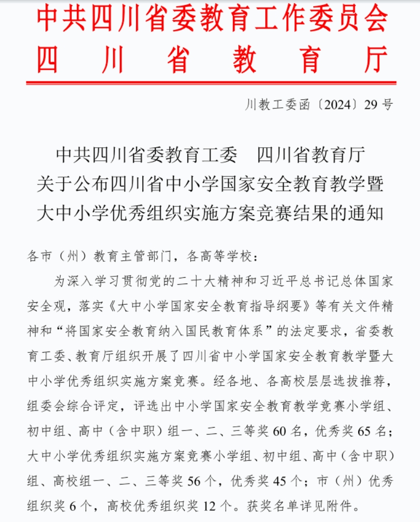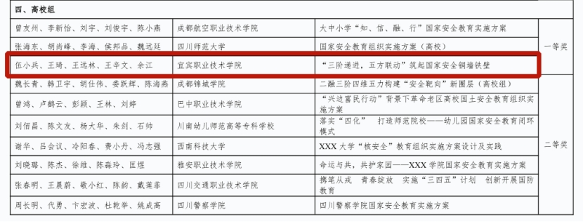 近日,中共四川省委教育工委、四川省教育厅公布了四川省大中小学国家安全教育教学暨大中小学优秀组织实施方案竞赛结果,由学院党委副书记、院长伍小兵领衔团队撰写的《“三阶递进,五方联动”筑起国家安全铜墙铁壁》荣获“优秀组织实施方案”高校组一等奖,我院荣获“高校优秀组织奖”。