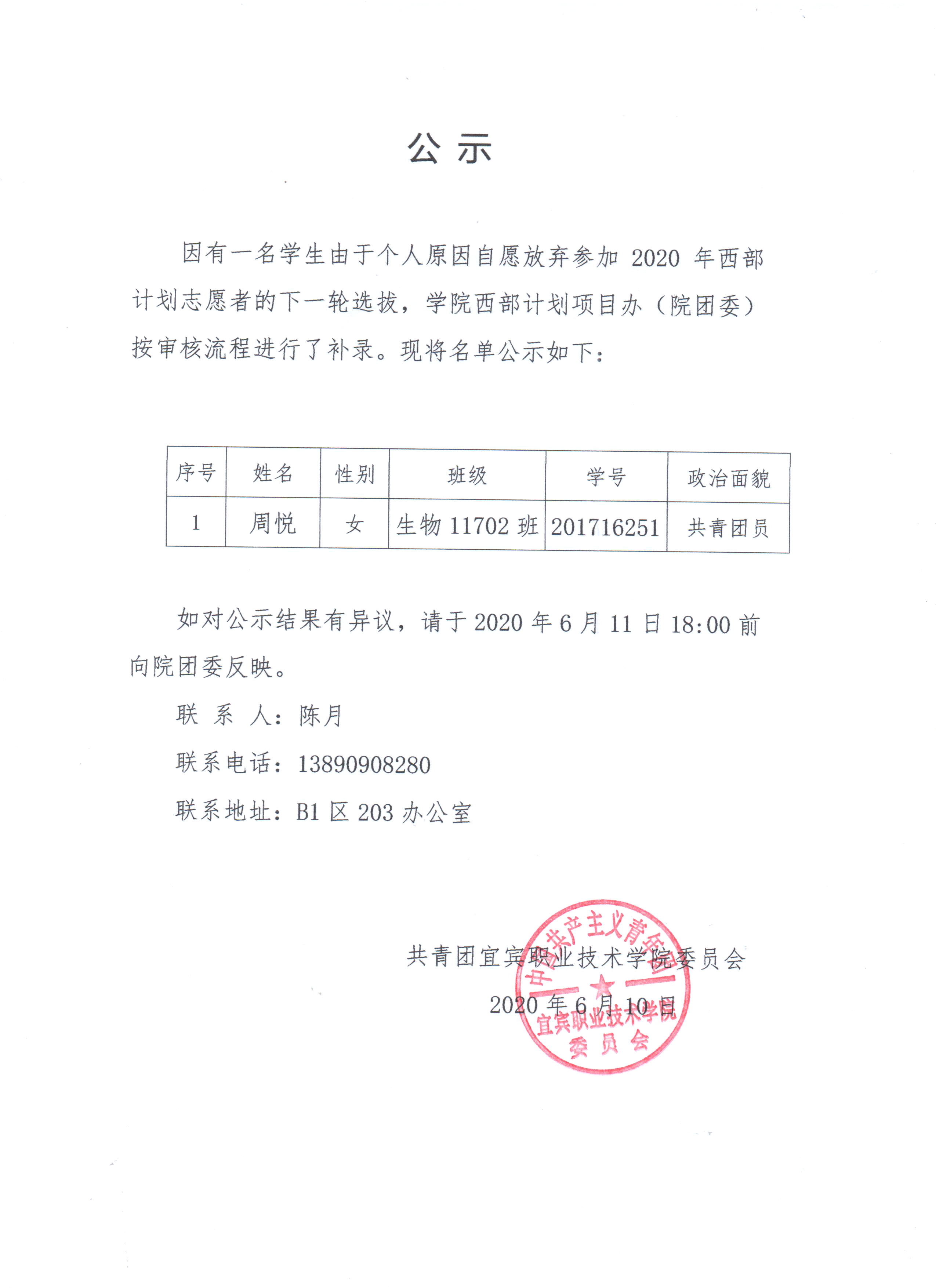 上一条:关于组织2020年宜宾职业技术学院西部计划志愿者面试和笔试的通知 下一条:宜宾职业技术学院2020年西部计划志愿者招募选拔复试人员名单公示