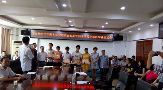 6月17日星期三下午3点,在宜宾职业技术学院科苑宾馆三楼会议室,举办了“江安县2015年劳务扶贫培训宜宾职业技术学院电商班结业座谈会”。在座谈会中首先是培训小组代表发言,培训代表表达了对本次培训给予支持的江安县政府以及学院表示真诚的谢意,并表示本次培训让他们对电子商务有了一个全新的认识,大大的增强了他们利用现代化技术开展农业经济活动的信心,也让他们对改造农村经济,提高农村收入带动全村农民集体致富有了新的想法。