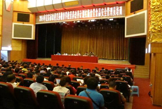 为加强全市学校食堂供餐食品安全工作的管理,进一步提高全市学校食堂供餐食品安全管理水平,确保广大师生饮食安全,依据国家食品药品监督管理局《餐饮服务单位食品安全管理人员培训管理办法》的相关规定,由宜宾市食品药品监督管理局、宜宾市教育局主办,宜宾职业技术学院承办, “2014年宜宾市农村义务教育学校营养改善计划实施食堂食品安全管理员第二期培训班”于2014年8月18日上午在蓝天宾馆举行开班典礼。