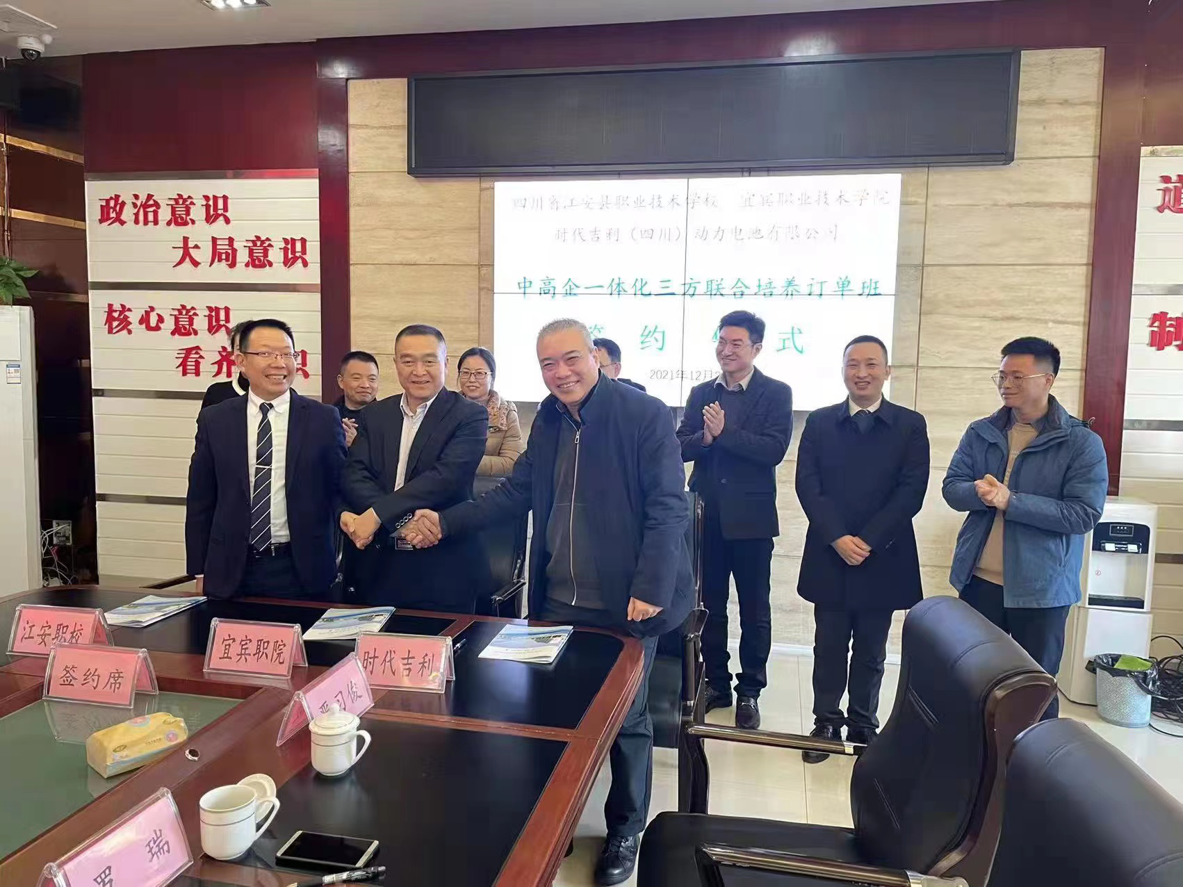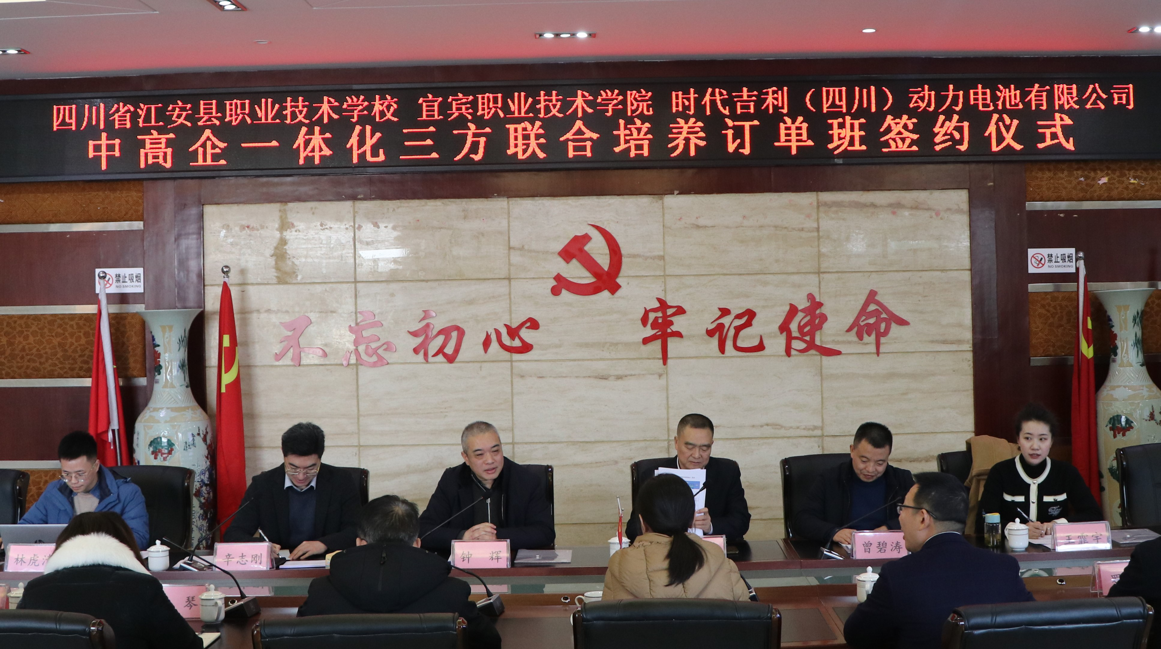 为了进一步实现人才培养目标与职业岗位需求对接,2021年12月22日,院党委常委、副院长江仁朝率新材料与化工能源学院党总支副书记、副院长曾碧涛一行赴江安县职业技术学校参加中高企一体化三方联合培养订单班签约仪式。时代吉利(四川)动力电池有限公司运营总监钟辉以及人力资源总监辛志刚、江安县人民政府副县长范晓莉、中共江安县委教育工委专职副书记罗铜亲临签约仪式现场。