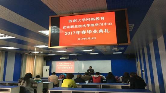 2017年2月19日西南大学网络教育与继续教育学院宜宾职业技术学院学习中心进行了2017年春季毕业典礼。由中心张秀英老师主持,宜宾职业技术学院继续教育部林伟副主任和部门老师、14秋批次毕业学员参加。