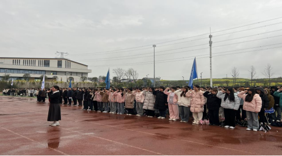 升旗仪式现场,伴随着雄壮激昂的《义勇军进行曲》,鲜艳的五星红旗冉冉升起,全体师生肃立行注目礼,齐声高唱国歌。