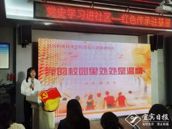“我们的宣讲目的,是让老百姓知道中国共产党一路走来的艰辛历程,了解我们今天的幸福生活来之不易,更加珍惜当下,更多地为国家作贡献。”学院教师、宣讲员余婷说:作为宣讲团的一员,首先自己在理论上要加强学习,用通俗易懂的讲解,让老百姓了解党史。而面对广大社区群众,在讲的形式上,需要更多地贴近他们的生活,在语言上,要使用一些老百姓容易理解的话,互动交流,体现实效。