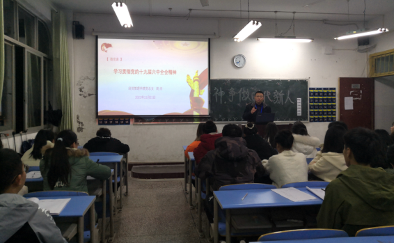 12月17日,经贸管理学院党总支书记周杰在第四教学楼B3多媒体教室为全体辅导员和学生代表宣讲党的十九届六中全会精神,并号召全体班主任给班上同学宣讲党的十九届六中全会精神,将学习精神贯穿学习始终。