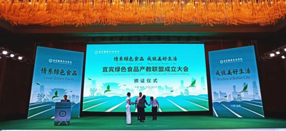 6月29日,以“情系绿色食品,成就美好生活”为主题的“宜宾绿色食品产教联盟”成立大会在宜宾市城市名人酒店名人厅召开。由宜宾职业技术学院、10所中职学校、30家宜宾龙头企业的嘉宾、代表共126人参加了成立大会。宜宾市农业农村局副局长肖平、宜宾市教育和体育局职成教科科长江波、宜宾市工业和军民融合局食品工业科科长郝玉柱,宜宾学院川茶学院院长赵先明教授、四川轻化工大学周健教授、宜宾职业技术学院党委副书记陈林出席会议。会议由宜宾职业技术学院副院长周黎军主持。