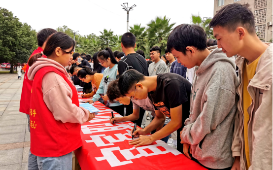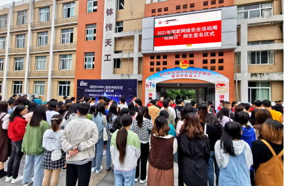 为深入宣传贯彻习近平总书记关于网络强国的重要思想,宣传贯彻习近平总书记对网络安全工作“四个坚持”的重要指示,提高全院师生网络安全意识和防护技能,2021年10月12日上午,学院2021年国家网络安全宣传周校园日“网络安全为人民,网络安全靠人民”师生签名活动在A区教学楼前举行。