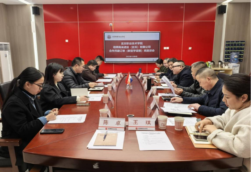 12月8日上午,宜宾职业技术学院与劲牌南溪酒业(宜宾)有限公司在通达园104会议室举行“订单班(新型学徒制)”校企合作座谈会。劲牌南溪酒业副总经理何朝玖、生产管理部长龙安、综合管理部长范亚琪、工艺督察组长赵达、招聘主管高霞,五粮液技术与食品工程学院党总支书记李强、院长曾欣、副院长梁宗余,智能制造学院党总支书记张德红,相关专业教研室主任及专业骨干教师参加座谈。会议由曾欣主持。