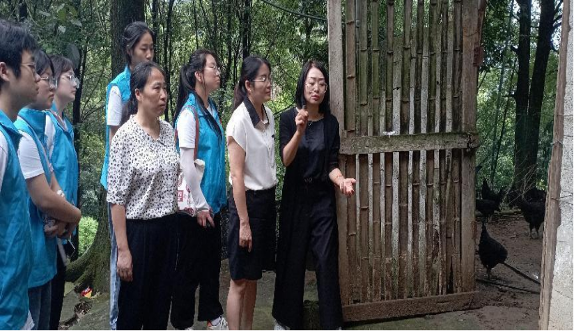 在兴文县鸿程农业生态科技开发有限责任公司,实践队听取了公司负责人任思琼讲述地标——乌骨鸡产业“合作社+基地+农户+龙头企业”四位一体的养殖模式、养殖技术、发展模式,并围绕助农研学、直播带货等助力乡村产业振兴话题进行探讨交流。