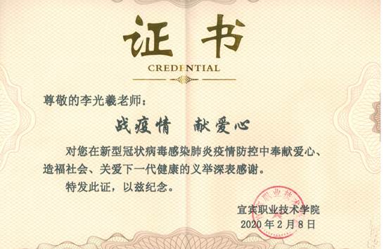 在此关键时刻,我院陆续收到爱心人士、爱心企业为我院捐赠的防控物资。2月7日,我院特聘教授、著名歌唱家李光羲老师及其团队联合北京家家吉利商贸有限公司慷慨为我院捐赠200把测温枪,支援我院师生抗击新型冠状病毒肺炎疫情,体现了一位老艺术家和爱心企业关心教育事业、关爱师生健康、大爱无私的崇高境界。宜宾天原集团为我院送来1吨次氯酸钠消毒液,解决了我院防控物资短缺的燃眉之急,充分体现了国企的担当和对宜宾高等教育事业发展的关心和厚爱。据了解,建设银行宜宾市分行也将为我院捐赠消毒液,用于学校办公、教学、学生宿舍区域消毒。