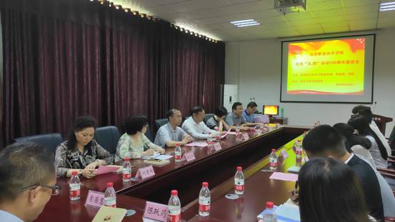 4月29日下午3:00,由学院宣传部、思政部、团委主办,宜宾市哲学研究会协办的宜宾职业技术学院纪念“五四”运动100周年座谈会隆重召开。会议由学院宣传部部长周杰主持。宜宾市哲学研究会会长、宜宾学院教授廖联奎,宜宾市哲学研究会副会长、宜宾学院教科院院长、教授何会宁,宜宾市哲学研究会副秘书长、宜宾学院马克思主义学院教师李桃。我院团委书记李小兵,思政部主任李卫平,宣传部副部长刘吉梅,思政部副主任陈跃筠,团委书记助理常茜惠,学院青年马克思主义学习社指导教师及学生代表参加了本次座谈会。