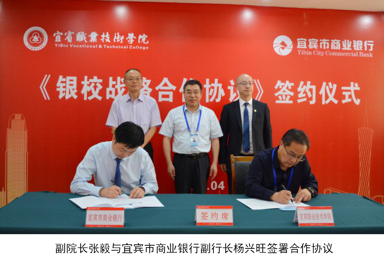 4月29日下午 15:00,宜宾职业技术学院与宜宾市商业银行战略合作协议签约暨宜宾职业技术学院二级学院名誉院长聘任仪式举行。宜宾市商业银行党委副书记、行长薛峰,党委委员、副行长杨兴旺,原宜宾五粮液股份有限公司副总经理、宜宾多粮浓香白酒研究院院长、首届中国酿酒大师刘友金,宜宾丰川动力科技有限公司总经理陈红旭,宜宾市智威科技有限公司总经理蒋杰,宜宾职业技术学院党委书记林世全,院长伍小兵,党委副书记、纪委书记陈林,副院长张毅、闫景丽,组织部部长江仁朝出席签约仪式。签约及聘任仪式由陈林主持。