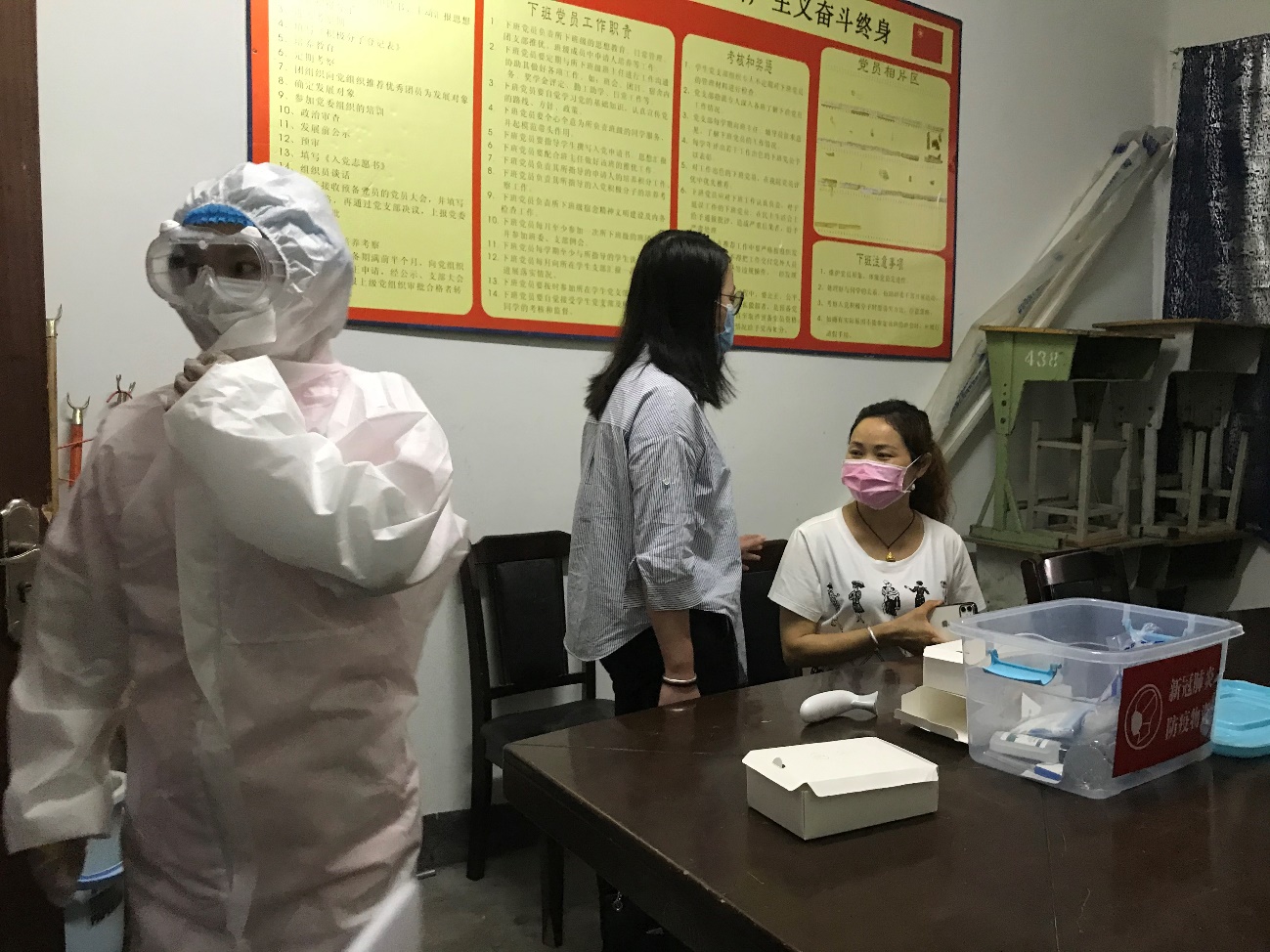 下午3时,应急演练有序推进。演练人员按照间隔一米的距离依次排队测量体温后进入宿舍。