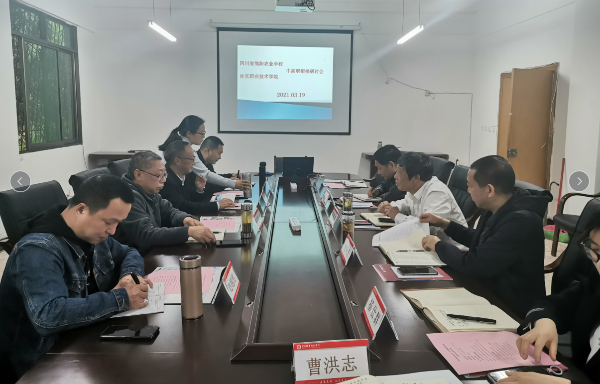 为进一步加强中高职衔接,服务区域特色经济,2021年3月19日,四川省绵阳农业学校纪委书记张克勇、四川省绵阳农业学校招生科科长候俊民、四川省绵阳农业学校第二党支部书记赵越胜、四川省绵阳农业学校农林经济教学部主任刘松青一行专程到我院开展中高职衔接研讨会。宜宾职业技术学院副院长周黎军、宜宾职业技术学院招生就业处处长张中东、现代农业学院院长先元华、现代农业学院党总支副书记杨仕群、现代农业学院畜牧兽医教研室主任曹洪志、现代农业学院农业技术教研室主任陈其敏参加了研讨会。