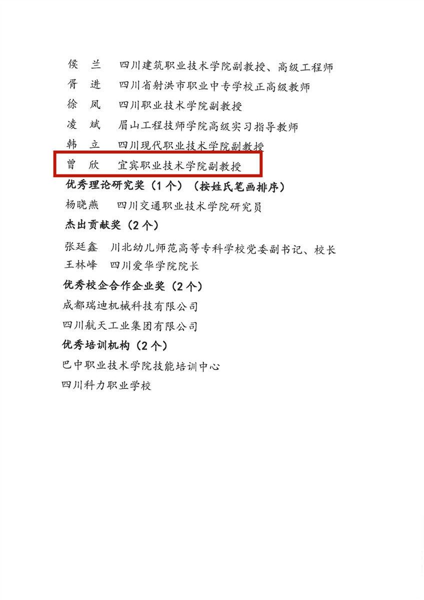近日,四川省中华职教社和重庆市中华职教社在两地教育、人社部门支持下,共同开展了首届“双城杯”黄炎培职业教育奖评选结果揭晓。我院王自敏教授、牟杨副教授、曾欣副教授获“杰出教师奖”。