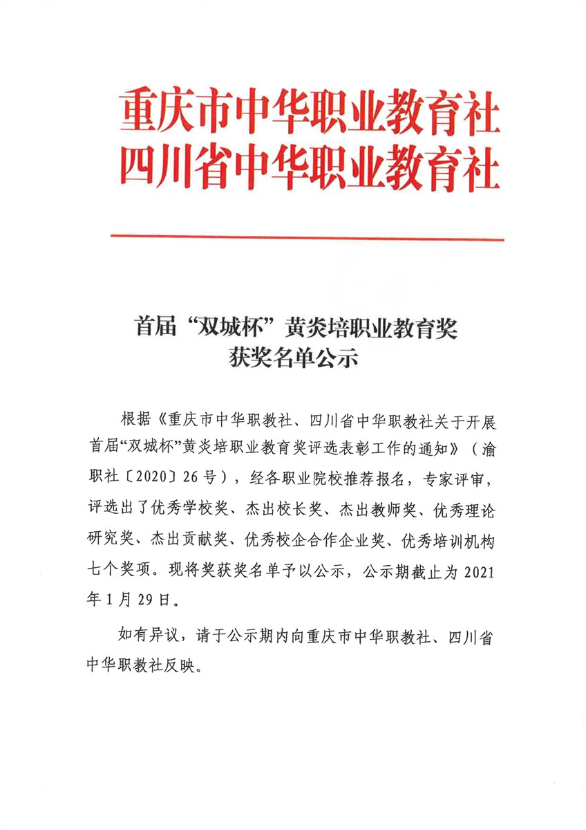 据了解,黄炎培职业教育奖是经国务院组织的全国清理规范评比达标表彰工作联席会议办公室审核保留的全国性奖项,是我国职业教育战线的唯一奖项和最高奖项,受到职业教育界的广泛关注和重视。本次评选表彰活动,本着“公开、公平、公正”的原则,经各职业院校报名推荐,通过专家评审、网上公示等程序,评选出川渝两地优秀学校奖20所、杰出校长奖13名、杰出教师奖44名、优秀理论研究奖5名,优秀校企合作奖5个,优秀培训机构奖4个、杰出贡献奖2名。