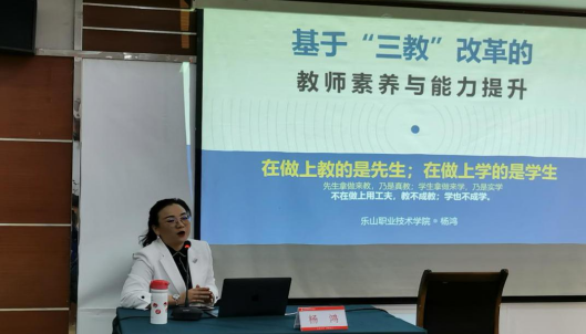 培训第一天,乐山职业技术学院教师、工商管理副教授,四川省SYB创业培训讲师、京东大学电商学院院校导师、四川省大学生创新创业导师团青年导师杨鸿以《基于“三教”改革的高校教师素养与能力提升”》为题,从“三教”改革的核心、教师的素养和能力、教师教学技能提升等三个方面,结合教师素质能力、教师分层类型、教师的核心能力、如何精准定位、教学方法提升等维度进行了阐述,提出要“教无定法、贵在得法”“在做上教的是先生,在做上学的是学生,不在做上用工夫,教不成教,学也不成学”“要通过赋能激活教师创造力,提升教师素养”等,讲座内容丰富、言语幽默、论述精辟,结合自身教学实践,事例典型生动、深入浅出,对于提高我院教师素养与能力具有很强的指导意义。
