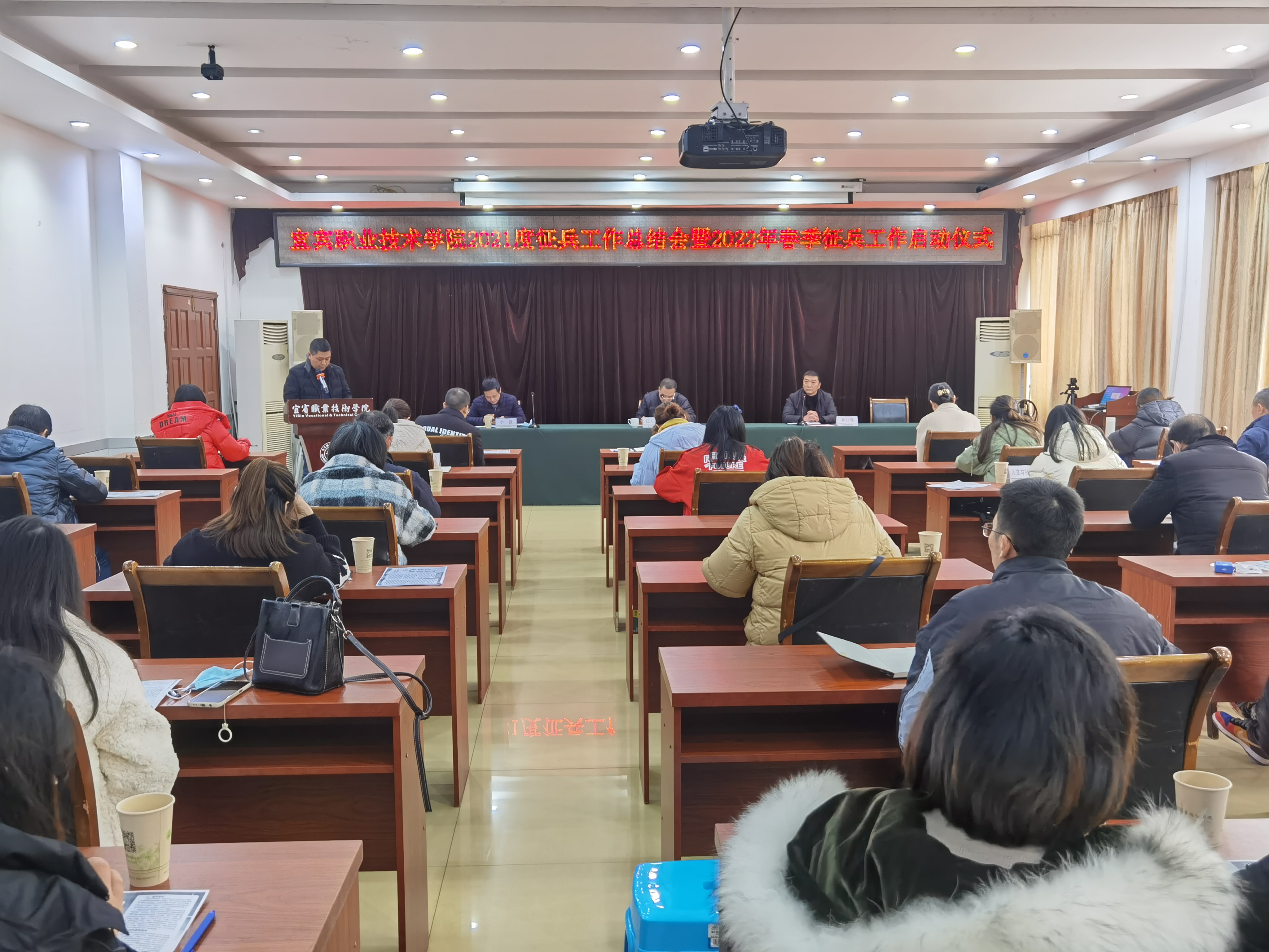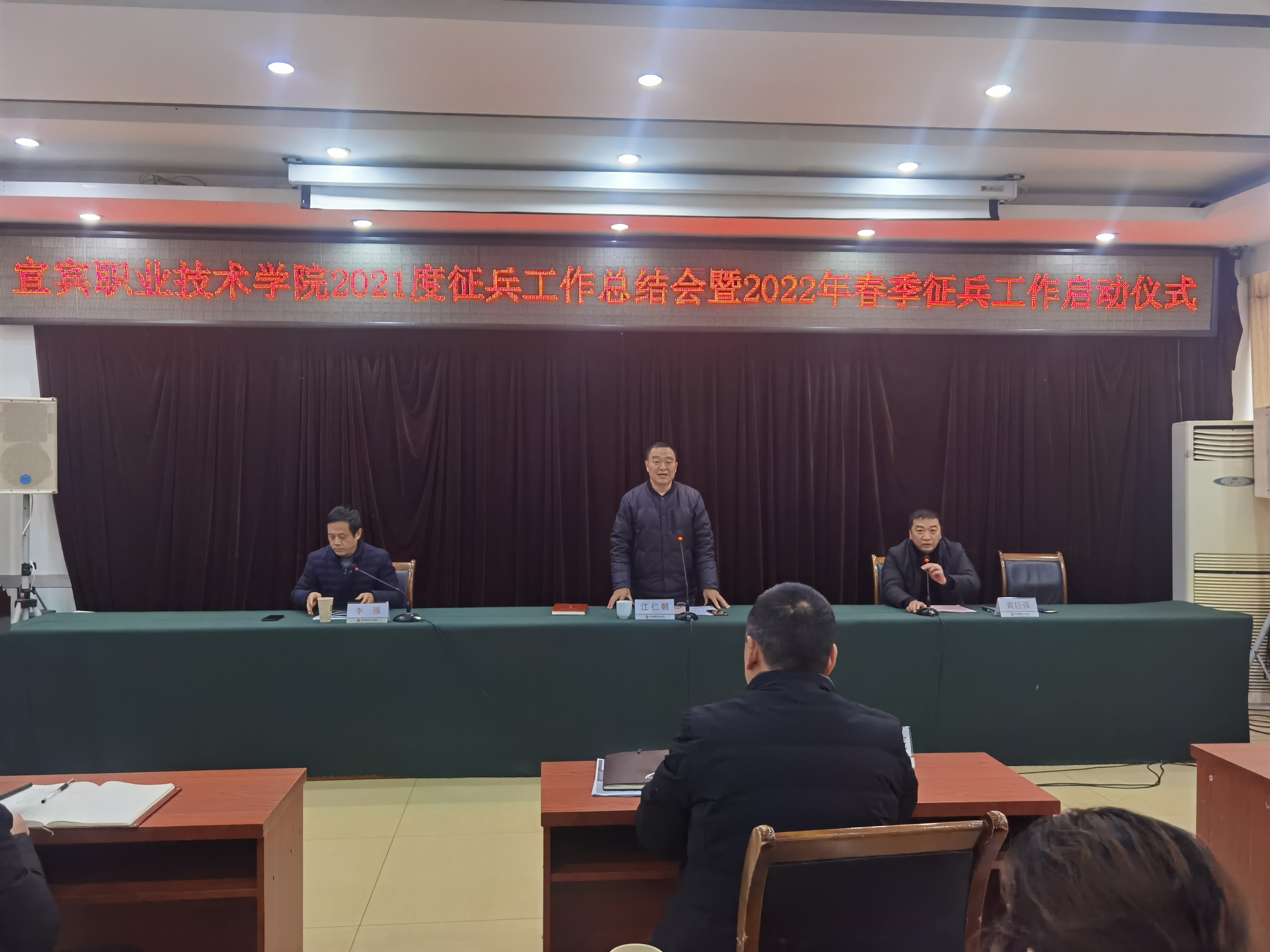 为深入贯彻习近平强军思想,更好为国防军队事业大力输送高技能人才,根据中央军委关于加强大学生征兵工作的决策部署,大力推进新形势下高校大学生征兵入伍工作。2022年1月6日,宜宾职业技术学院春季征兵工作启动仪式在科苑宾馆三楼大会议室举行。会议由安全保卫部副部长黄巨强主持。学院党委常委、副院长江仁朝同志出席会议并讲话。
