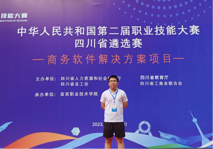5月30日,我院2021级学生王少君在中华人民共和国第二届职业技能大赛四川省遴选赛中荣获“商务软件解决方案”赛项第一名。