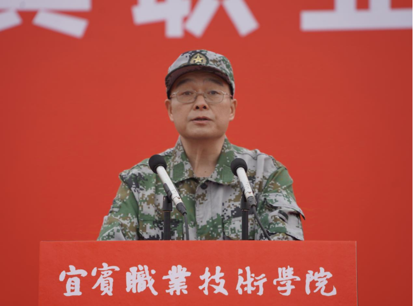 动员大会在雄壮的国歌声中拉开帷幕。江仁朝代表学院宣读《宜宾职业技术学院关于任命张昂等125名同志为2024级学生军训干部的任职通知》,明确了本次军训学生建制,即1个军训团、9个营、63个连,实行团、营、连三级管理体制。