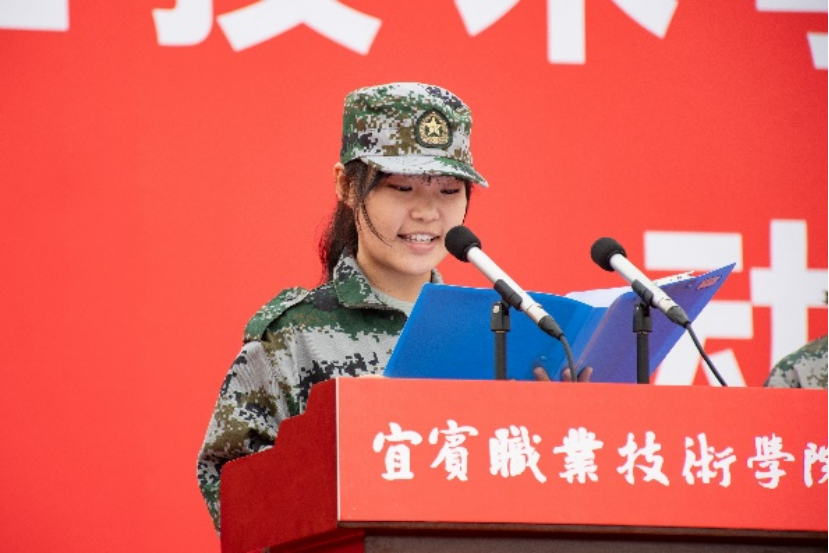 经贸管理学院财务12402班洪心怡同学代表全体参训新生庄严宣誓:认真参训,听从指挥,团结协作,步调一致,挖掘潜力,丰富自己,用青春的汗水书写更美的自己,用矢志不移的决心强军报国。