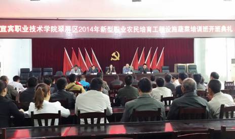 2014年10月31日,由宜宾职业技术学院承办的翠屏区2014年新型职业农民培育工程设施蔬菜生产培训班在翠屏区菜坝镇镇政府正式开班,共有来自菜坝镇各乡村组的蔬菜生产合作社57名学员参加了培训,我院继续教育部部长李卫平、翠屏区农牧局党委副书记王雅棣、翠屏区农牧局政工科教科长周萍、翠屏区菜坝镇副镇长李杰等领导出席了开班仪式。