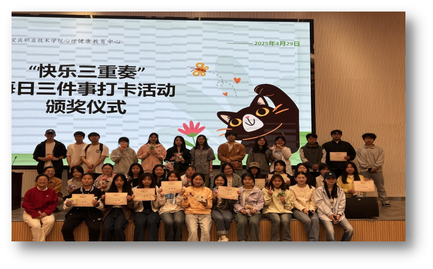 4月29日中午12时30分,心理健康教育中心在崇信楼117举行了“快乐三重奏”每日打卡活动的颁奖仪式。活动根据参与学生在3月12日至4月12日期间,每日三件事的打卡持续天数以及打卡内容质量进行综合评比,筛选出一、二、三等奖。